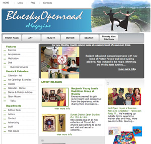 While each contributor can still maintain his/her own website, our e-magazine provides a place for each of them to add new monthly ideas or information, as well as listing any new services or products (with staff assistance) in their own individual shop in our Mall. BlueskyOpenroad contributor pages link back to individual websites, boosting all concerned in internet search hierarchies.Contained in the e-magazine are articles covering new events, services and products; calendars featuring classes, venues, gigs, openings and events; plus links to Mall Shops and personal profile pages.